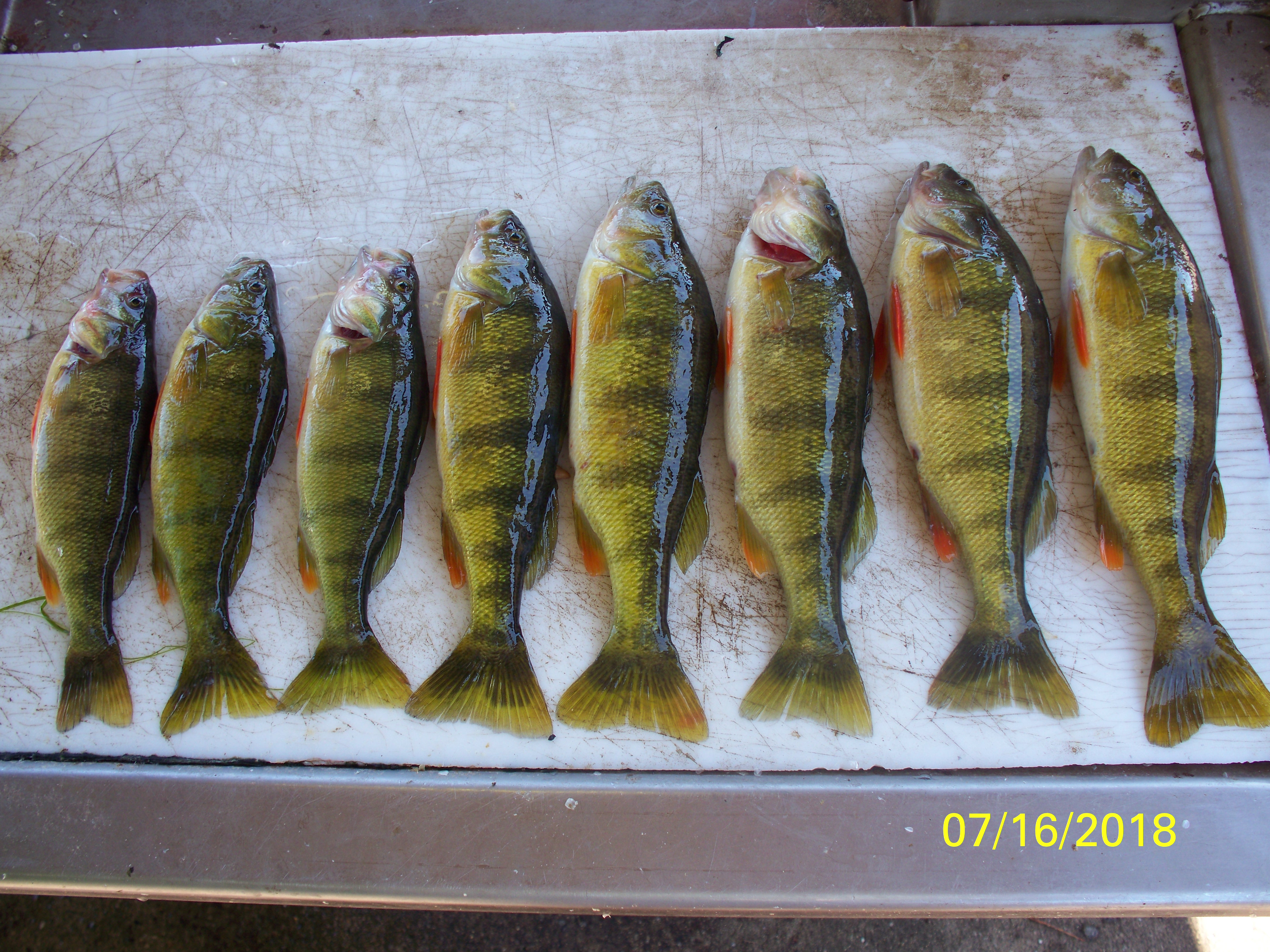 Fishing Perch out of Park II, with Brian Belonger... 10' of water...Catching 23 Perch... Biggest 13 1/2" / 13 1/4"... Beautiful day... 0' to 1' waves and HOT ...fishing by 7: 30 am, quite at 11:00 am....