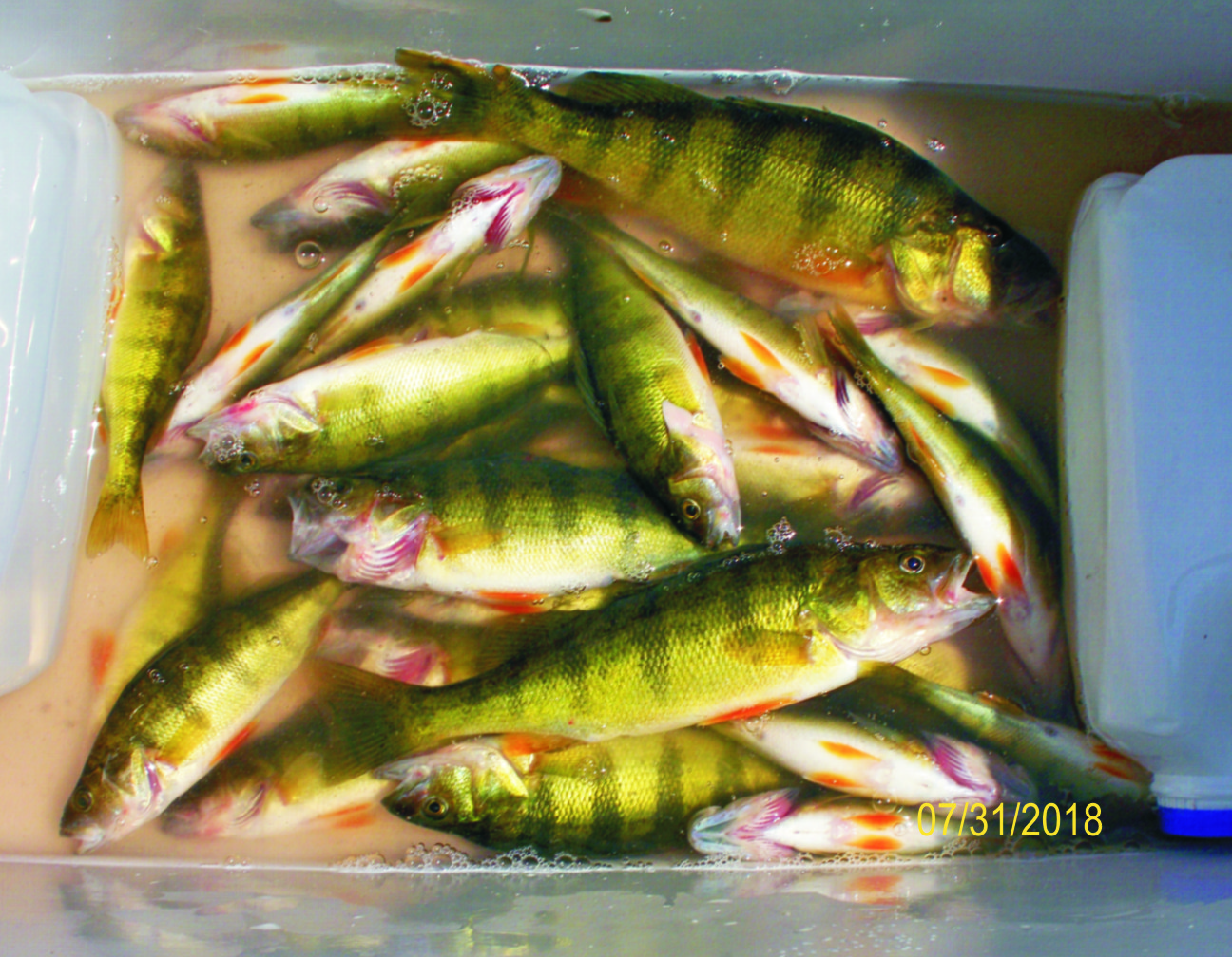 Fishing with Roger Miller.... Today was much "better" than yesterday, catching a limit (30) Perch... Biggest being 11 1/2" ...starting at 6:00 am and finished by 11:00 am. it was calm for the first 3 hours, with the wind picking up out of SE. Struggled for the last 3...